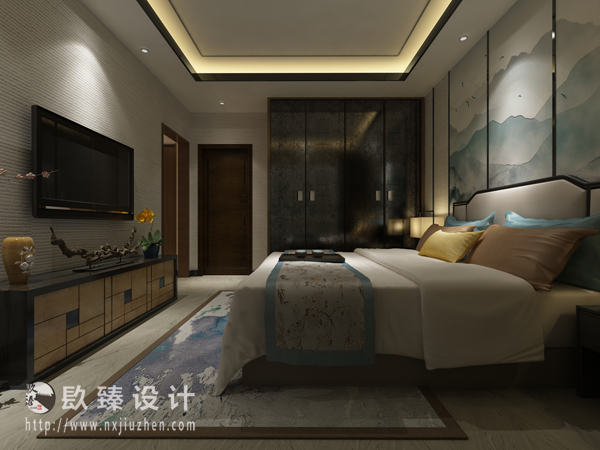 本案特點是將現代元素與傳統元素相互結合的形式而產生的,同時以現代人的觀點來體現出與傳統中國風格不一樣的設計。同時新中式風格大多數采用對稱性的設計,體現出一定的協調性。
