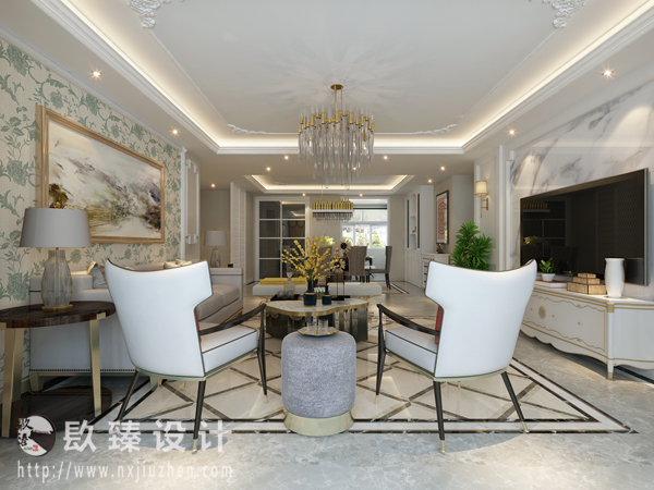 客廳色彩采用白灰為主色調,打造空間的高級感。客廳采用吊燈和頂部射燈,為房間提供良好的照明。不同的光源交織在一起,打造舒適的居住體驗。
