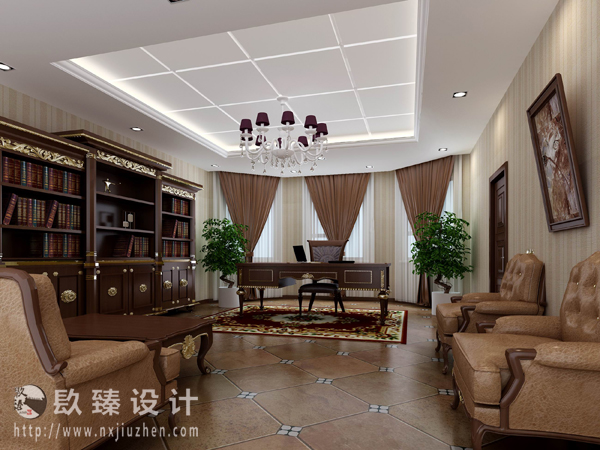 該辦公室的整體追求歐美現(xiàn)代裝修風(fēng)格,沉穩(wěn)的背景墻,再配飾色調(diào)一致的木質(zhì)書柜跟桌椅,讓整室顯得更加深沉和自然,再加上飄逸而沉穩(wěn)的紗織窗簾,更能彰顯其獨(dú)有而嚴(yán)肅的風(fēng)格,安靜沉穩(wěn)且相間白色小花瓣的瓷板磚,更能反映設(shè)計師追求一種安逸美的情調(diào)。