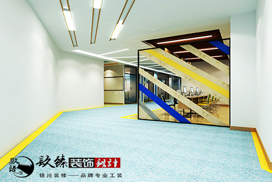 銀川裝飾公司|銀川辦公室裝修設(shè)計|設(shè)計師楊芮設(shè)計的創(chuàng)業(yè)孵化園風(fēng)格非常的多彩,顏色搭配的非常的濃重,使用黃色和藍色,這樣冷暖相互搭配也是起到了相互吸引的效果,辦公室內(nèi)的環(huán)境讓人一看就非常有創(chuàng)新,非常的年輕化。再加以明亮的造型燈帶,幾何的造型,體現(xiàn)出了別致的時尚創(chuàng)新風(fēng)格,更能拉伸室內(nèi)的空間。