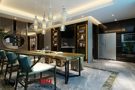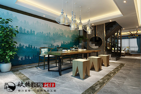 銀川裝修設計镹臻裝飾中的新中式別墅一共有三層,第一層除了客廳旁設計了茶室一間,對于成功人士來說中國的茶文化是不可缺的一部分,在品茶過程中體會人生中的苦樂酸甜,是對生活的一種向往。木質古典風格的桌椅身后是一幅布滿畫布的迎客松,要知道茶文化和迎客松都是中式文化中的精髓,所體現出的藝術形式正好符合該別墅的整體風格,樓梯處以鏤空造型的隔墻將兩個空間用專業的手法完美銜接。
