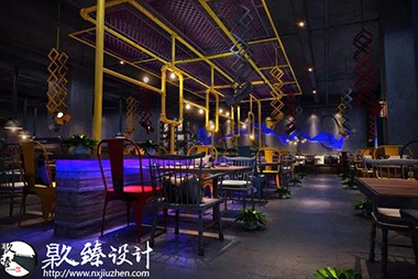 燒烤店其中的一角文化墻上的海苔是這片空間為數不多的綠植,為工業風格的燒烤店帶來一抹綠意,小清新躍入眼簾,很好的緩解了視覺疲勞。清水混凝土墻與鋼的巧妙配合,鐵管與暖色燈光的色彩互動,削減了鋼鐵冷視覺,柔和了空間美。原木的置物架上擺放著主人心愛的藏品,或許是幾個空酒瓶,或許是一卷麻布,又或者是一對仿真羚羊角,全憑主人心情與愛好,也許別人并不覺得有多么珍貴,但是在主人眼里他卻是無價之寶。將工業風格與燒烤店完美的結合起來,鋼鐵空間中也不乏柔情,設計的韻味就體現在此處。