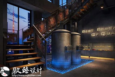 光看圖片暗色系的裝飾給人以不真實的感覺,用清水混凝土、鋼、原木等自然物架構打造內部空間,局部綠植的點綴,冷暖色調的反差對比,給人以夢幻的感覺,并營造出復古懷舊的浪漫氣氛,也更好地強調了設計的主題。粗糙的水泥抹平地面是粗狂的,然而藍紫色燈光又給了這片空間一種妖艷的視覺感受。