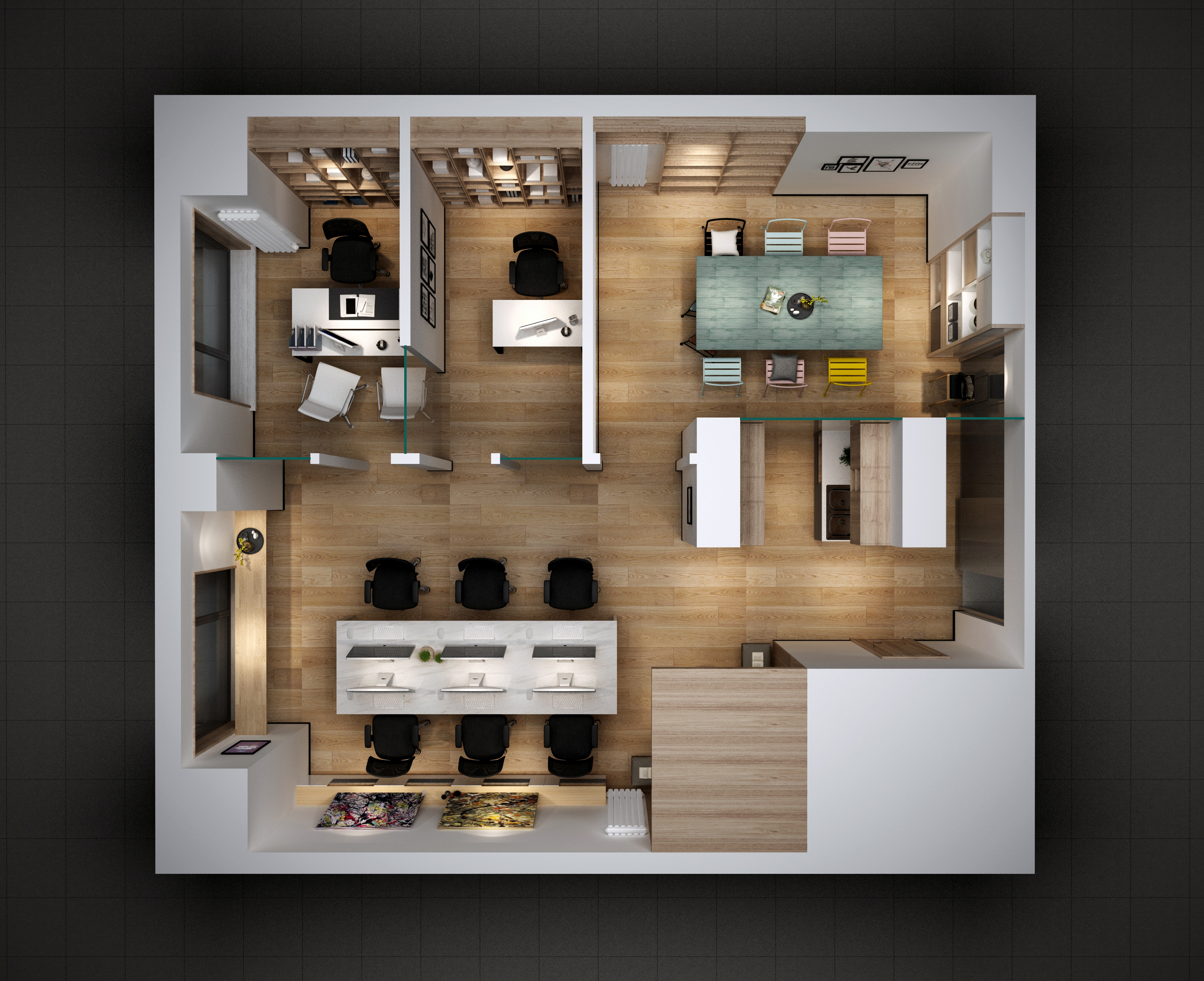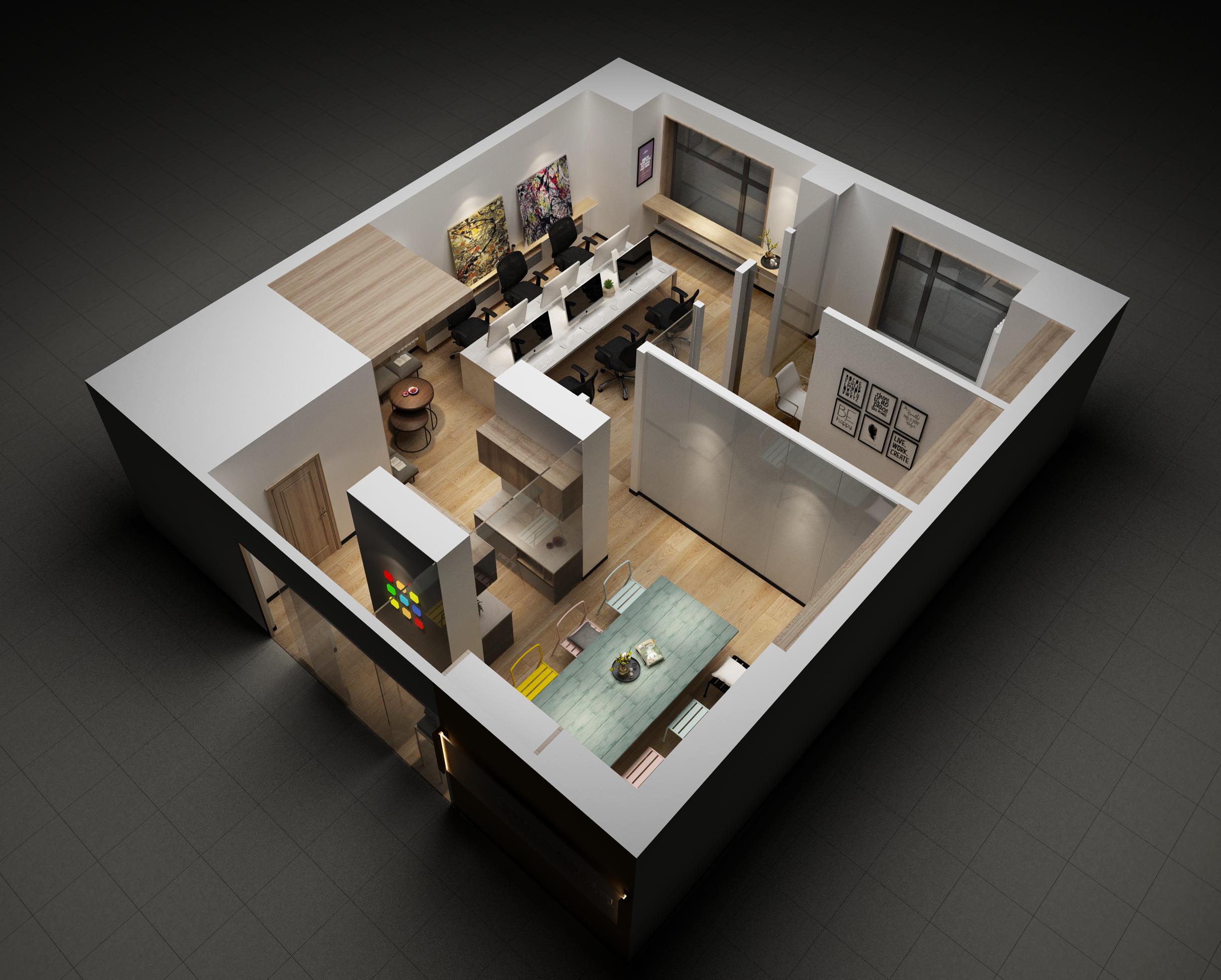 在以上設計案例圖中,可以看到有限的空間里設計了會議室,員工辦公區域,以及一些特殊的單人辦公室(適合于人事行政部,財務室之類)。甚至還有經理辦公室。可謂是辦公室的功能非常齊全,設計師使用黑色與灰色搭配的方式,能夠竟可能的吸收燈光和光線,這使得整個辦公室從觀感上絲毫沒有狹小的感覺,能夠勁量給人舒適的余地,同時在辦公室之間,辦公室和會議室之間使用半墻隔開,這樣的區分恰到好處的在擴展觀感空間的同時絲毫沒有浪費有限尺寸,可謂是十分完美的考量。而獨特的窗戶,窗臺,畫冊布置,更給予整個幫公司觀感上的充足空間感和舒適感,相信在這里辦公的人心情一定會愉悅。