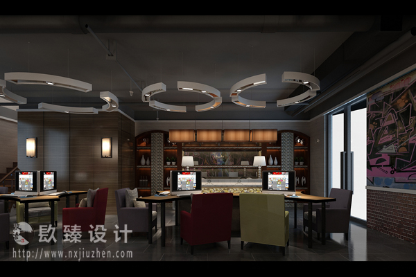 同時,設計師在網咖功能分區,以人性化的服務理念為主,旨在為大家打造愉悅空間,設計師希望通過不一樣的風格,為大家帶來享受和舒適的空間。在燈飾上,設計師采用富有個性的燈,也讓整個網咖看起來富有個性。