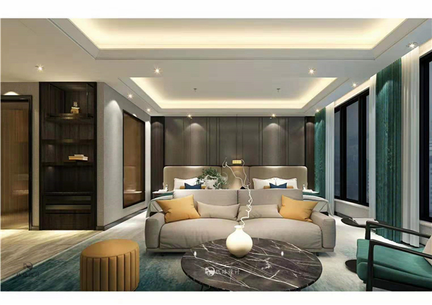 使用胡桃色木質材料作為柜體的主打色,這種顏色給人一種沉穩,低調,復古藝術的感覺,對于一些出差需要和客戶溝通的人士,該酒店是不二之選。將生活的空間進行細化,區域進行裝飾分化,客房內的簡約,高雅格調以及具有新中式古典風格的陳設營造了舒適的休閑空間。