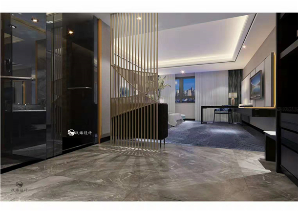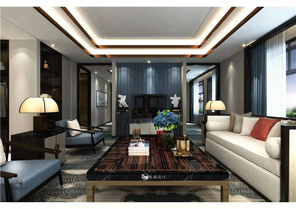 頂面多數使用新中式線條吊頂,低調中不失奢華,輕盈的金屬吊頂與檀木相結合,奢華與尊貴也彰顯了格調。衛生間使用地磚,墻磚,金屬,玻璃等材質,會增加原本看起來比較小的空間,視覺上給人一種明亮的感覺,地毯用比較復古的深藍色系,和墻面的灰色搭配起來非常的有質感,整體空間屬于比較冷色系的感覺,純靜,安逸感油然而生。