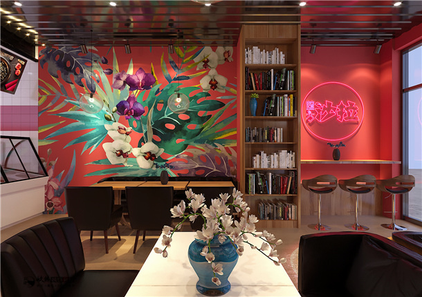 本案例整個內部結構嚴密緊湊、空間穿插有序、圍護各界面要素的虛實構成要比較明顯,等候區通過虛實互換的空間形象,取得局部與整個空間的和諧。現代咖啡廳的設計不僅要有文藝的感覺,還要讓顧客有種視覺美,通過視覺體驗帶給人美好的食欲,裝修風格既要有復古氣息也要有文藝氣息,整體設計以柔美時尚的色調而成,在點綴著好看的花朵,法式文藝氣息彰顯的淋漓盡致。