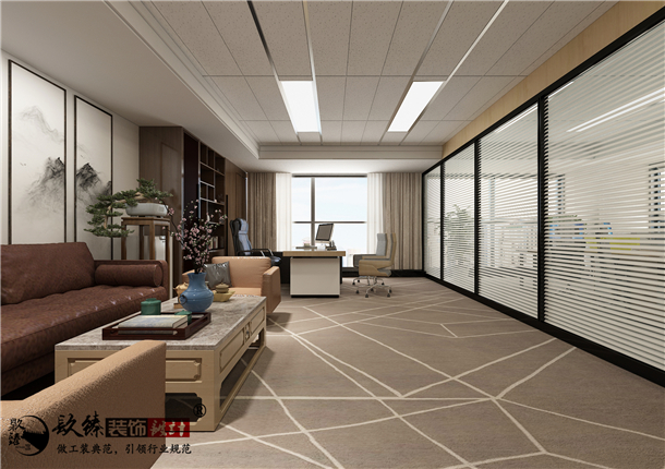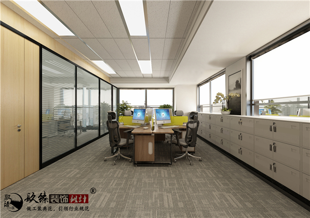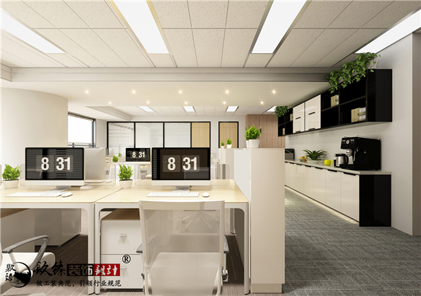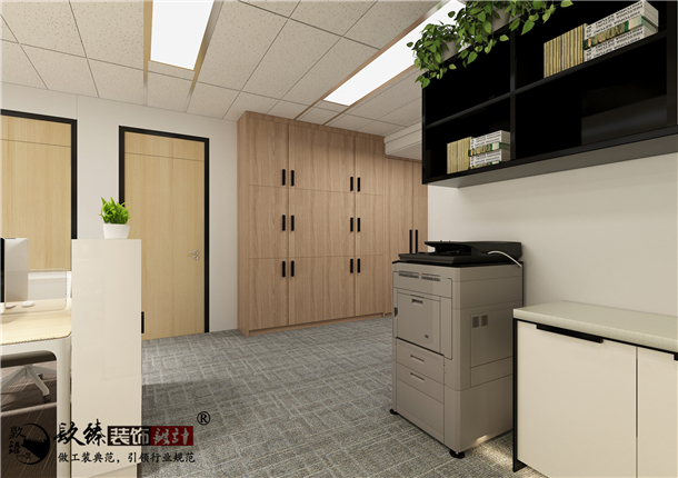 摒棄了一切繁文縟節的矯飾,一切盡在實用、明快而流暢的格局中;配合現代辦公環境的追求,設置實用與展示性相結合的半高書柜,旁倚商務型辦公桌,既陳設精雅、品味清亮、格調一致,又可于繁忙后賞窗外 風光、待客會友;直接在原頂噴涂乳膠漆,凸顯了現代辦公的簡潔,利用不同的燈具劃分了辦公、會客區的燈光。