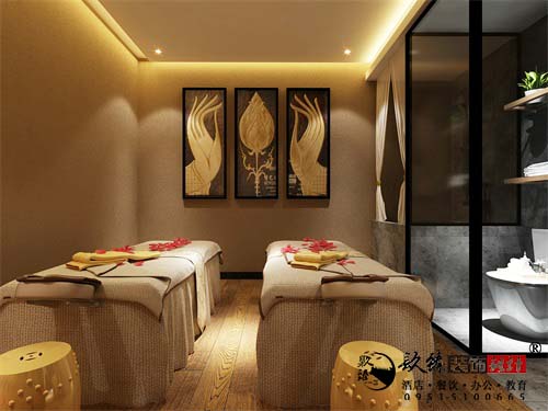 現代都市生活節奏越來越快,人們的生活壓力越來越大,養生保健也逐漸被人越來越重視。足療是一種很流行的保健形式,采用足底按摩的形式,讓人們疲倦的身體得到完全放松,對人的身體健康有著很大幫助。今天給大家帶來的是泰式養生會所設計案例。在設計中,我們搜集了大量泰式傳統裝飾素材,并對這些素材進行整合再創造,揉入現代設計理念的同時保持了原汁原味的泰國風情,力求為客人打來最純粹的泰式感受。這種回歸自然、原滋原味的生活,近年來以其獨有的魅力和熱帶風情也深受人們的喜愛。大廳以深色系的空間底色作為背景,與空間里跳脫的米黃色棕色等陳設品形成調和與均衡,地面以粗糲的顆粒感表達溫馨寧靜的輕松氛圍。干凈的線條,柔熙的燈光,溫馨明亮,平衡節制。人行至此間,于舒適沙發小坐,品一茗清茶,悠閑自得。在注重傳統的同時,也創造了優雅的品味。足浴按摩室設計以現代之形續寫傳統意境,以時尚之物訴說高雅品味,簡單的線條搭配光影的變化,營造有張力的色彩氛圍。整體選用純天然材質,通過對天然材質的運用使空間散發著濃厚的自然氣息。色彩斑斕的搭配,在燈光下閃耀著華麗熱情的光芒,制造出異彩紛呈的異域國度風情。